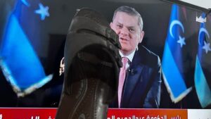 وأظهرت الصور المتداولة رفع المواطنين للشباشب والأحذية في وجه الدبيبة أثناء خطابه وتعليقه على تسليم المواطن الليبي أبو عجيلة المريمي.