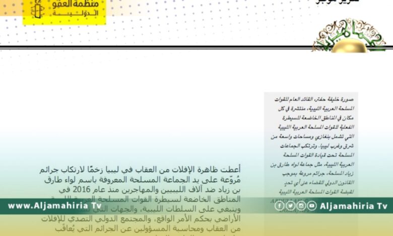 وقالت العفو الدولية  في تقريرها، أن الجماعة المسلحة المعروفة بكتيبة طارق بن زياد، ألاف الليبين والمهاجرين لانتهاكات وحشية ارتكبت بلا هوادة منذ عام 2016.
