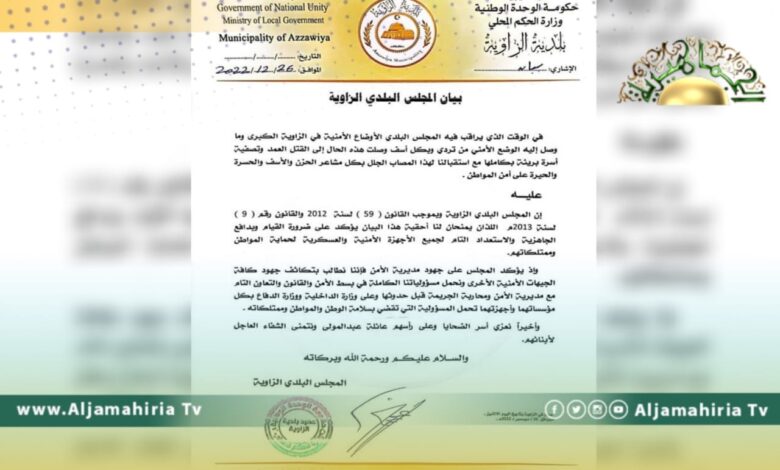 أكد المجلس البلدي الزاوية استمرار تردي الأوضاع الأمنية في الزاوية الكبرى، مشيرا إلى متابعته ما وصل إليه الحال من قتل عمد وتصفية أسرة بريئة بالكامل.