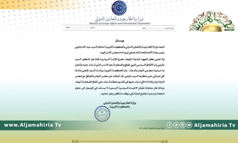 وقالت الوزارة، في بيان، إنها تذكر المبعوث الأممي بأن الاتفاق السياسي الموقع في الصخيرات هو الأساس الذي تستند عليه شرعية البرلمان، ومجلس الدولة الإخواني، وأن الحكومة برئاسة فتحي باشاغا، جاءت بالتوافق بين المجلسين السابق ذكرهما وأن المادة 64 التي استند إليها في خطته هي اتفاق الصخيرات أيضا.