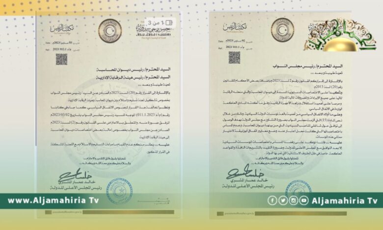 في سياق متصل، أعلن المشري رفضه لقرار سحب صلاحيات ديوان المحاسبة، وذلك في خطاب وجهه إلى رئيس مجلس النواب عقيلة صالح. معتبرا القرار يمس اختصاصات المؤسسات السيادية، دون توافق مع المجلس الأعلى للدولة، ومشددا على ضرورة التقيد بالتشريعات والقواعد الحاكمة.