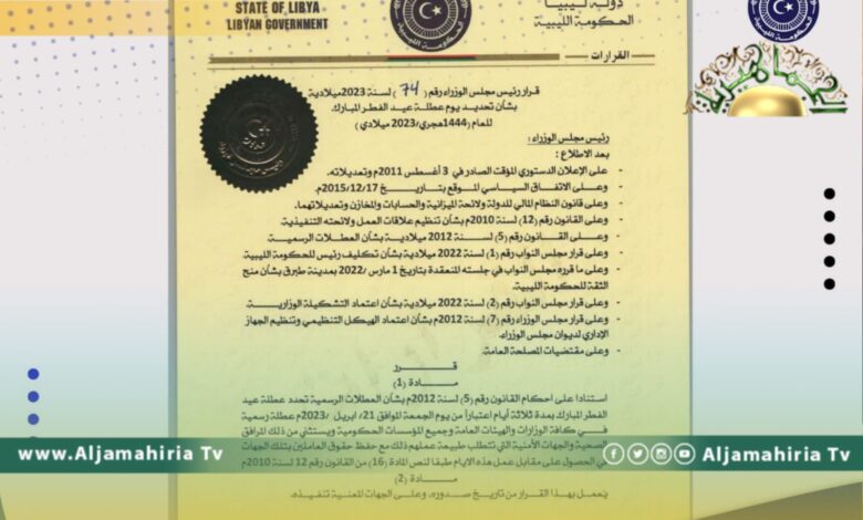 وأوضح باشاغا في قراره الصادر تحت رقم 74 لسنة 2023، أن عطلة عيد الفطر محددة بثلاثة أيام اعتبارا من يوم الجمعة 21 إبريل، وهي عطلة رسمية في كافة الوزارات والهيئات العامة وجميع المؤسسات الحكومية، ويستثنى من ذلك المرافق الصحية والجهات الأمنية التي تتطلب طبيعة عملهم ذلك مع حفظ حقوق العاملين بتلك الجهات في الحصول مقابل عمل هذه الأيام.