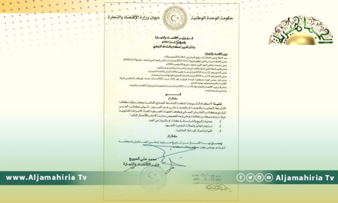 في إطار الاحتجاجات التي تضرب الزاوية، حثت وزارة الاقتصاد والتجارة بحكومة الدبيبة، الأجهزة الضبطية والجهات المختصة على تنفيذ قرار حظر مزاولة الأنشطة التجارية كافة بالتجزئة أو بالجملة على غير الليبيين.