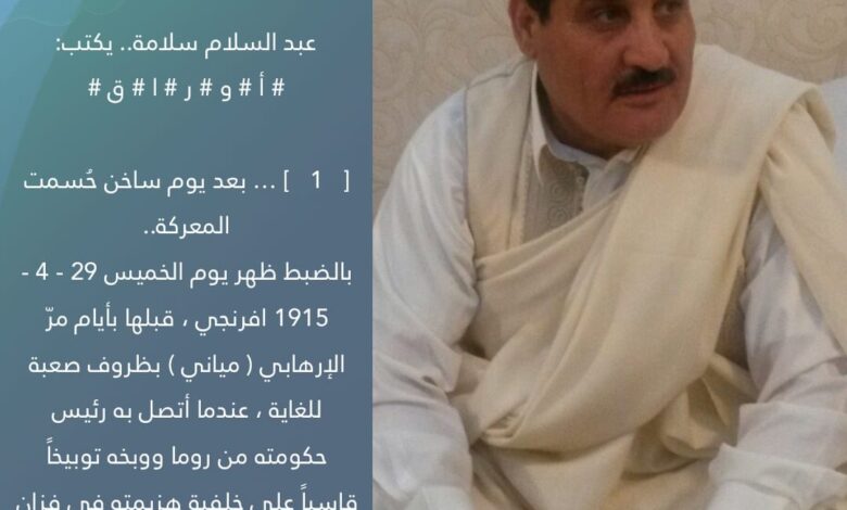 بالضبط ظهر يوم الخميس 29 – 4 – 1915 افرنجي ، قبلها بأيام مرّ الإرهابي ( مياني ) بظروف صعبة للغاية ، عندما أتصل به رئيس حكومته من روما ووبخه توبيخاً قاسياً على خلفية هزيمته في فزان ، وقال له: