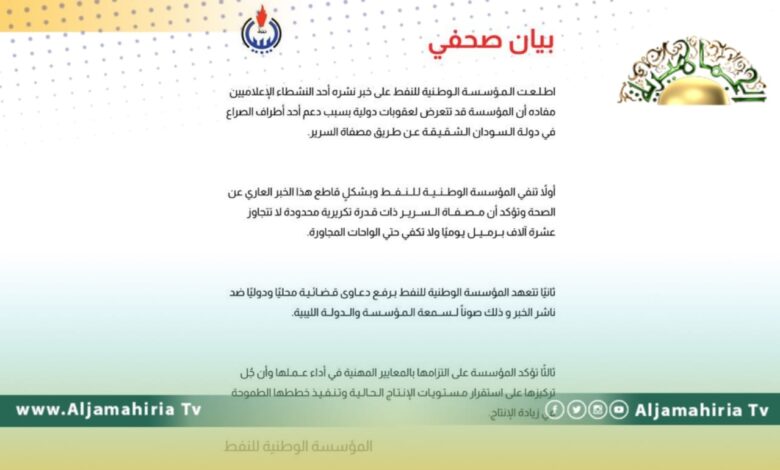 وأوضحت مؤسسة النفط في بيان لها طالعته “الجماهيرية”، إنها اطلعت على خبر نشره أحد النشطاء الإعلاميين، مفاده أن المؤسسة قد تتعرض لعقوبات دولية بسبب دعم أحد أطراف الصراع في دولة السودان الشقيقة عن طريق مصفاة السرير.