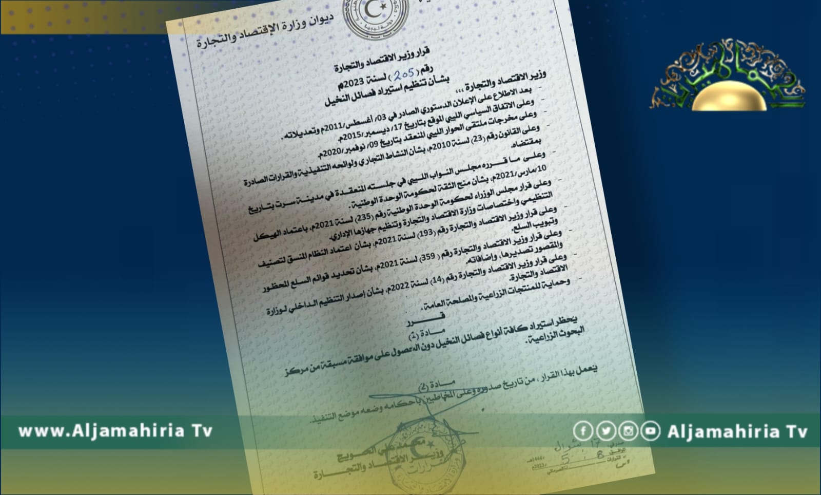 جاء ذلك في قرار وزير الاقتصاد محمد الحويج رقم 205 لسنة 2023 بشأن تنظيم استيراد فصائل النخيل، والذي تضمن العمل بهذا القرار من تاريخ صدوره، مشددا على المخاطبين بأحكامه بوضعه موضع التنفيذ.