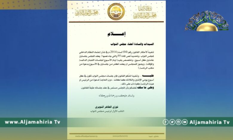 أبلغ النائب الأول لرئيس مجلس النواب فوزي النويري، النواب بالانعقاد الأسبوعي للجلسات وفقاً للقانون دون الحاجة لدعوة للانعقاد.