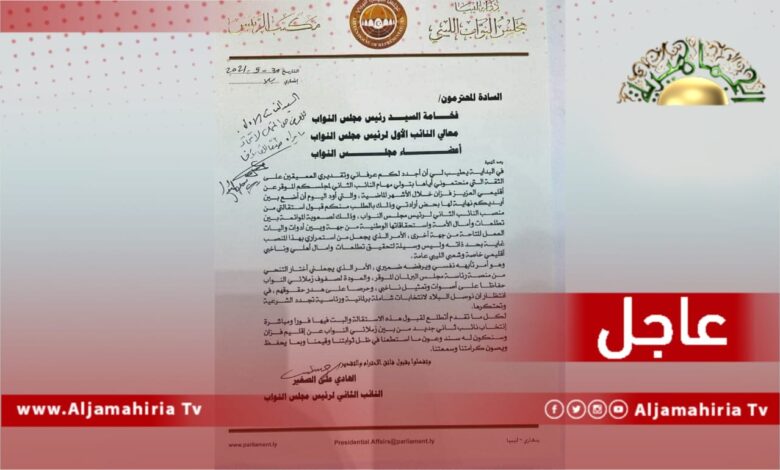 عاجل// النائب الثاني لرئيس مجلس النواب الهادي الصغير يتقدم باستقالته من منصبه لعقيلة صالح طالبا البت فيها فورًا وانتخاب نائب ثانٍ من فزان