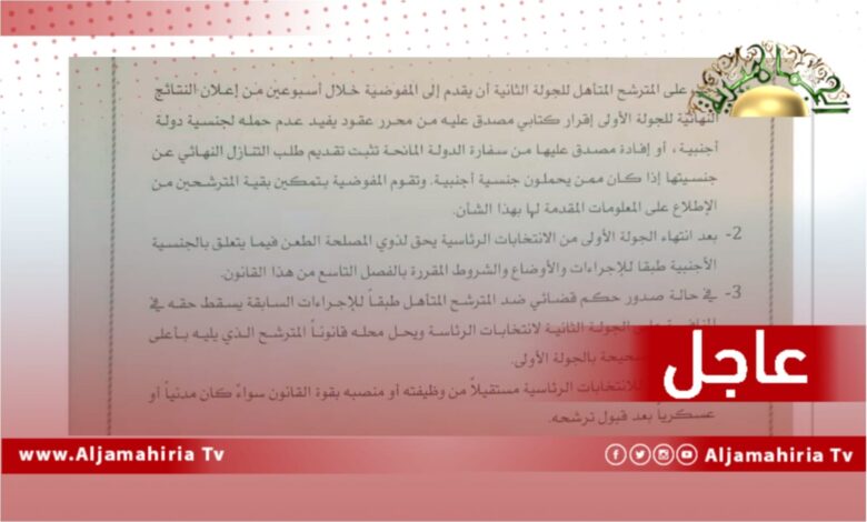 عاجل/ لجنة “6+6”: في حالة صدور حكم قضائي ضد المترشح الرئاسي يسقط حقه في المنافسة على الجولة الثانية للانتخابات ويحل محله قانوناً الذي يليه بأعلى الأصوات الصحيحة بالجولة الأولى