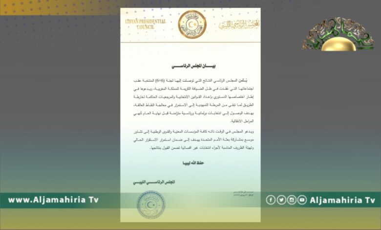 كما دعا المجلس الرئاسي في الوقت ذاته كافة المؤسسات المعنية والقوى الليبية إلى تشاور موسع بمشاركة بعثة الأمم المتحدة يهدف إلى ضمان استمرار الاستقرار وتهيئة الظروف المناسبة لإجراء انتخابات غير إقصائية تضمن القبول بنتائجها.
