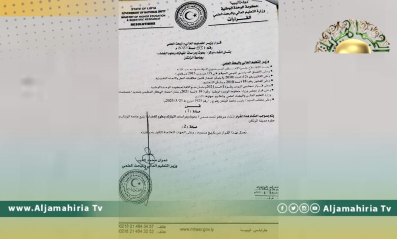 وبحسب قرار وزير التعليم العالي والبحث العلمي، الذي حمل رقم “531 لسنة 2023″، فإن مركز “بحوث ودراسات النيازك وعلوم الفضاء” المزمع إنشائه يتبع جامعة الزنتان ويكون مقره مدينة الزنتان.