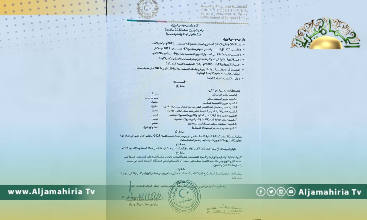 رغم المعارضة الشديدة لقراراته، وهدر الموازنة العامة في مشروعات ليس لها طائل طوال عامين في الحكم. أصدر رئيس وزراء حكومة الوحدة المؤقتة، عبد الحميد الدبيبة قرارًا بتشكل لجنة برئاسة وزير المواصلات وعضوية وزيرا الحكم المحلي والتخطيط، تتولى اعداد مقترح توزيع ميزانية التنمية لعام 2023. على أن تراعي الأولوية للمشروعات الجاري تنفيذها.