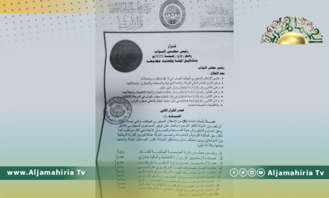 أصدر رئيس مجلس النواب، عقيلة صالح، قرارا بتشكل لجنة وتحديد مهامها برئاسة رئيس مؤسسة النفط فرحات بن قدارة، تتولى وضع تصور لإعادة هيكلية الميزانية العامة.