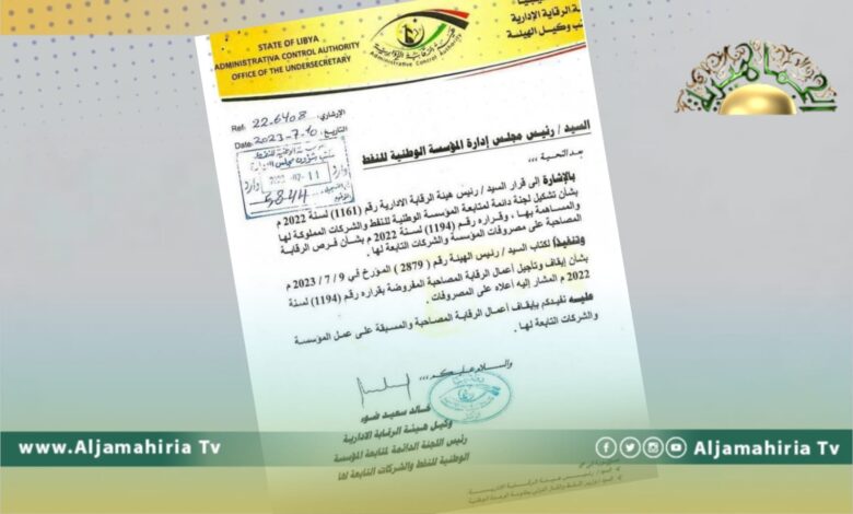 وجاء هذا في خطاب رسمي، وجهته هيئة الرقابة الإدارية لرئيس مجلس إدارة مؤسسة النفط.