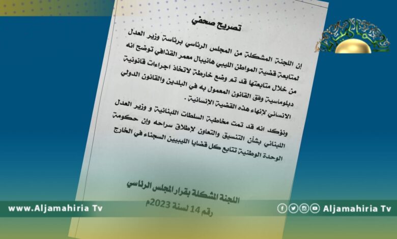 اللجنة المشكلة بقرار الرئاسي تعلن مخاطبة السلطات اللبنانية لإطلاق سراح هانيبال القذافي