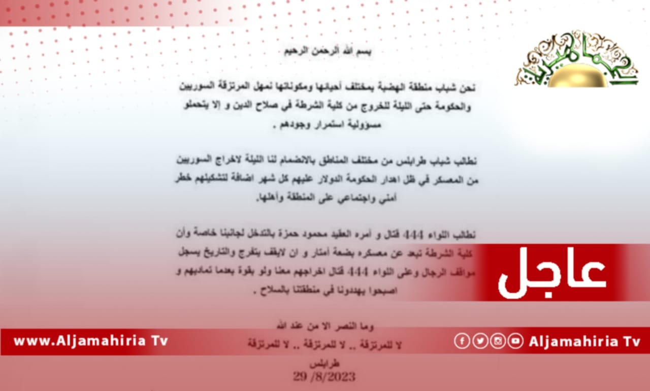 عاجل// شباب الهضبة يطالبون السوريين الخروج الليلة من معسكر كلية الشرطة في صلاح الدين ويطلبون من الـ 444 الوقوف معهم.
