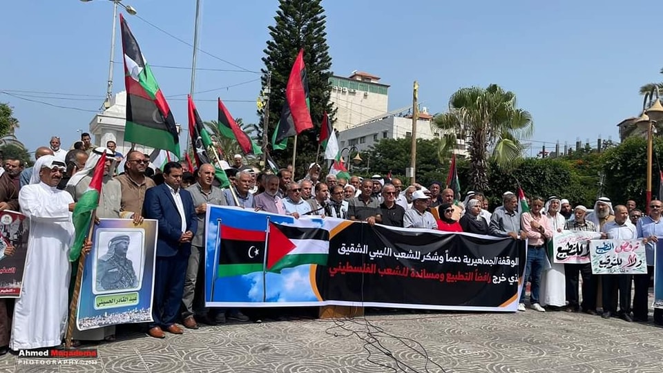 نظم أهالي مدينة غزة، وقفة احتجاجية داعمة لموقف الشعب الليبي وانتفاضته ضد التطبيع الذي تقوم به حكومة الدبيبة في طرابلس، والهبّة الشعبية والغضب ضد وزيرة الخارجية الموقوفة، نجلاء المنقوش إثر لقائها السري في روما، مع وزير خارجية الكيان الصهويني إيلي كوهين.