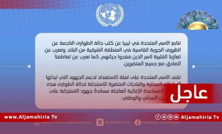 عاجل// البعثة الأممية: نتابع عن كثب حالة الطوارئ الناجمة عن الظروف الجوية القاسية بالمنطقة الشرقية بالبلاد
