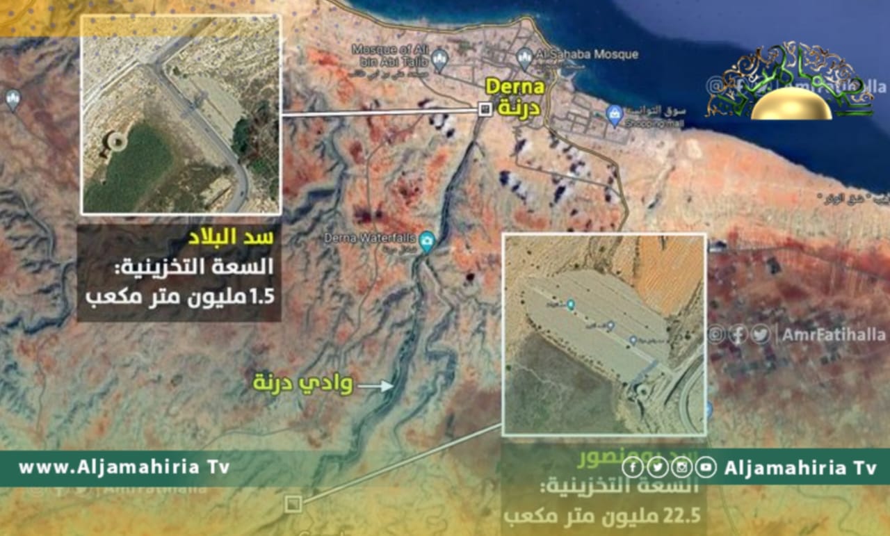 –يحمي مدينة درنة إثنان من السدود الركامية، الأول يقع على بعد 13 كم واسمه “سد بومنصور” وسعته التخزينية 22.5 مليون متر مكعب، والثاني يقع على بعد 1 كم من المدينة واسمه “سد البلاد” وسعته التخزينية 1.5 مليون متر مكعب.