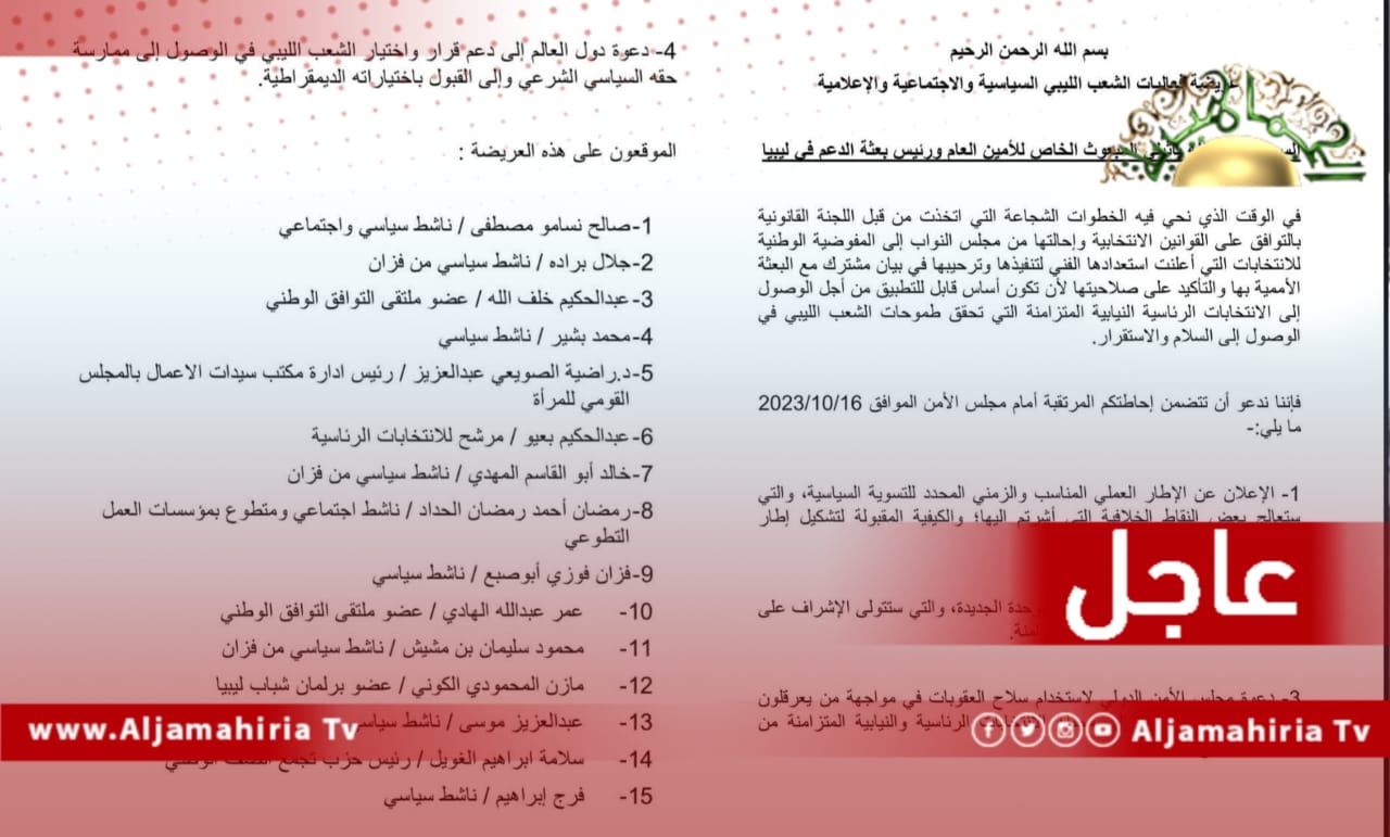 عاجل// عريضة مشتركة من 302 مُترشحًا للانتخابات الرئاسية والبرلمانية لمطالبة باتيلي بأن تتضمن إحاطته أمام مجلس الأمن اتخاذ خطوات جادة نحو إجراء الانتخابات.
