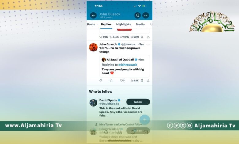 رد الممثل الأمريكي الشهير جون كوزاك على تدوينة نشرها المهندس الساعدي القذافي على حسابه في منصة إكس.