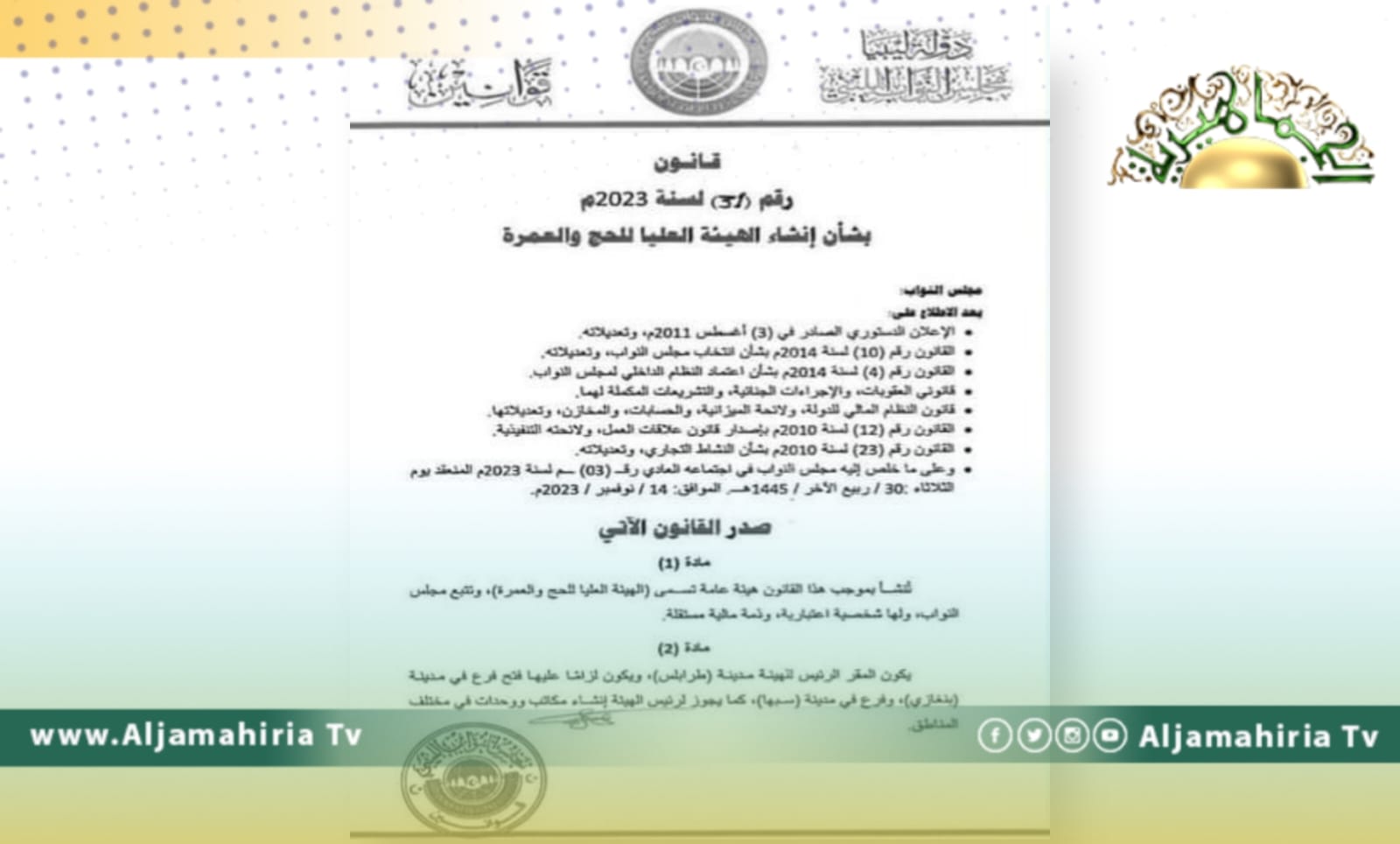 أصدر مجلس النواب، قرار بقانون إنشاء الهيئة العليا للحج والعمرة. ويكون لها شخصية اعتبارية وذمة مالية مستقلة.