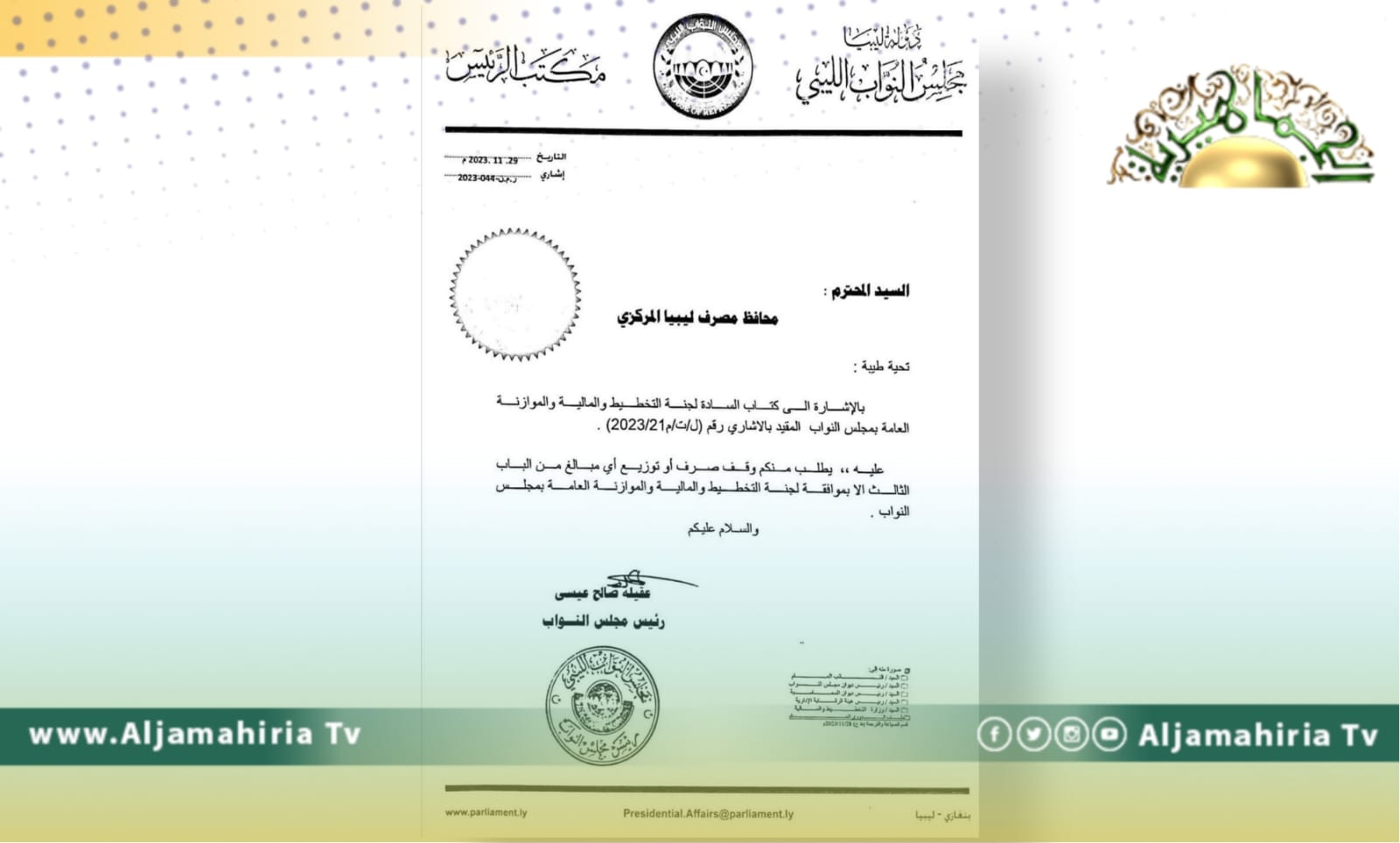طالب رئيس مجلس النواب عقيلة صالح، محافظ مصرف ليبيا المركزي، بوقف صرف أو توزيع أي مبالغ من الباب الثالث.