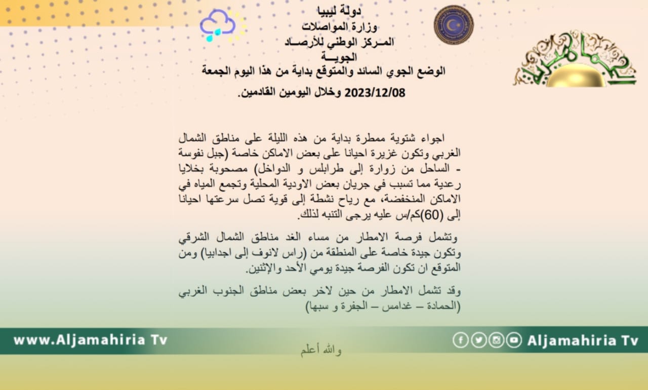 وأشار المركز إلى أن الأمطار ستكون غزيرة خاصة (الجبل الغربي – الساحل من زوارة إلى طرابلس و الدواخل) مصحوبة بخلايا رعدية مما تسبب في جريان بعض الاودية المحلية وتجمع المياه في الاماكن المنخفضة، مع رياح نشطة إلى قوية تصل سرعتها احيانا إلى (60)كم/س عليه يرجى التنبه لذلك.