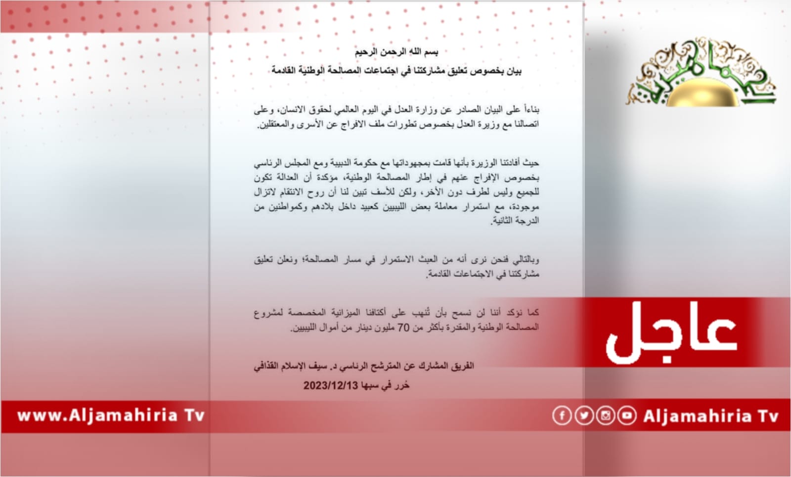 الرئيسية/محلي/عاجل/ الفريق المشارك عن المترشح الرئاسي الدكتور سيف الإسلام القذافي: وزيرة العدل أكدت بذلها مجهودات للإفراج عن الأسرى من النظام الجماهيري عاجلمحلي عاجل/ الفريق المشارك عن المترشح الرئاسي الدكتور سيف الإسلام القذافي: وزيرة العدل أكدت بذلها مجهودات للإفراج عن الأسرى من النظام الجماهيري 13 ديسمبر، 2023 13 ديسمبر، 2023 فيسبوك تويتر بينتيريست واتساب تيلقرام ڤايبر مشاركة عبر البريد طباعة