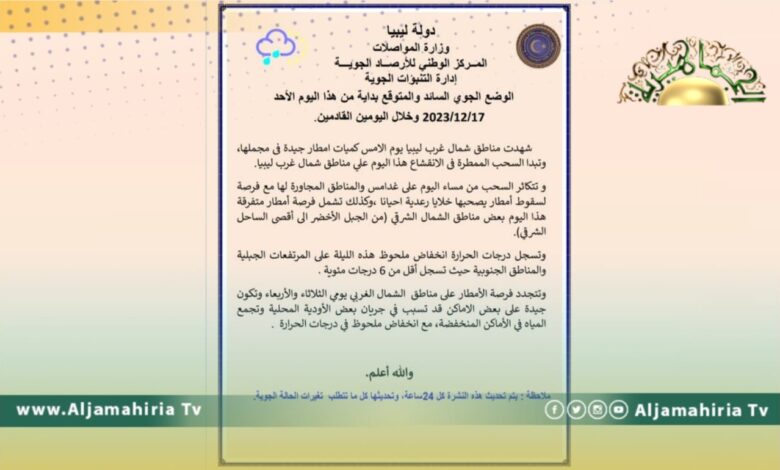وجاء بيان الأحوال الجوية المتوقعة على ليبيا، اليوم الأحد وخلال اليومين القادمين كالتالي:-