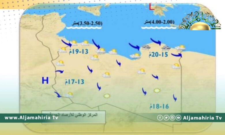 توقع مركز الأرصاد الجوية، طقس بارد على أغلب مناطق ليبيا حيث درجات الحرارة القصوى تتراوح مابين(14-20)مْ، وتنخفض اثناء الليل والصباح الباكر إلى مادون (03) مْ على مناطق الجنوب الغربي ، مع رياح نشطة على المناطق الساحلية.