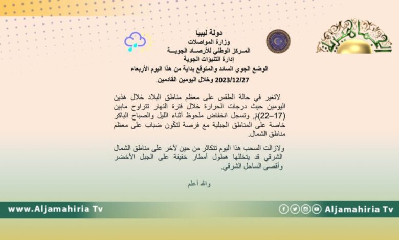 وجاء بيان الأحوال الجوية المتوقعة على ليبيا اليوم الأربعاء، وخلال اليومين القادمين كالتالي:-
