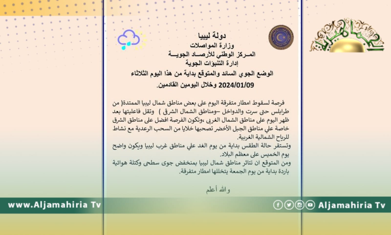 وجاء بيان الأحوال الجوية المتوقعة على ليبيا اليوم الثلاثاء وخلال اليومين القادمين كالتالي:-