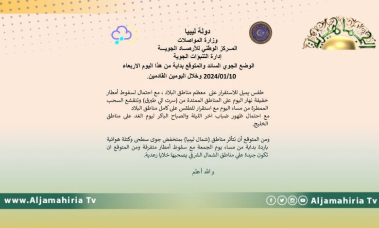 وجاء بيان الأحوال الجوية المتوقعة على ليبيا كالتالي:-
