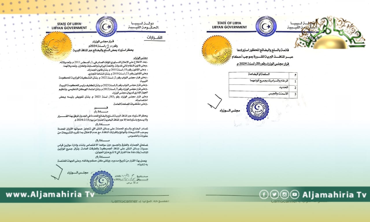 قرر رئيس الحكومة المكلفة من النواب أسامة حماد حظر استيراد عدد من السلع عبر المنافذ البرية وهي الرخام والسراميك بجميع أنواعهما، والحديد والأسمنت والجبس.