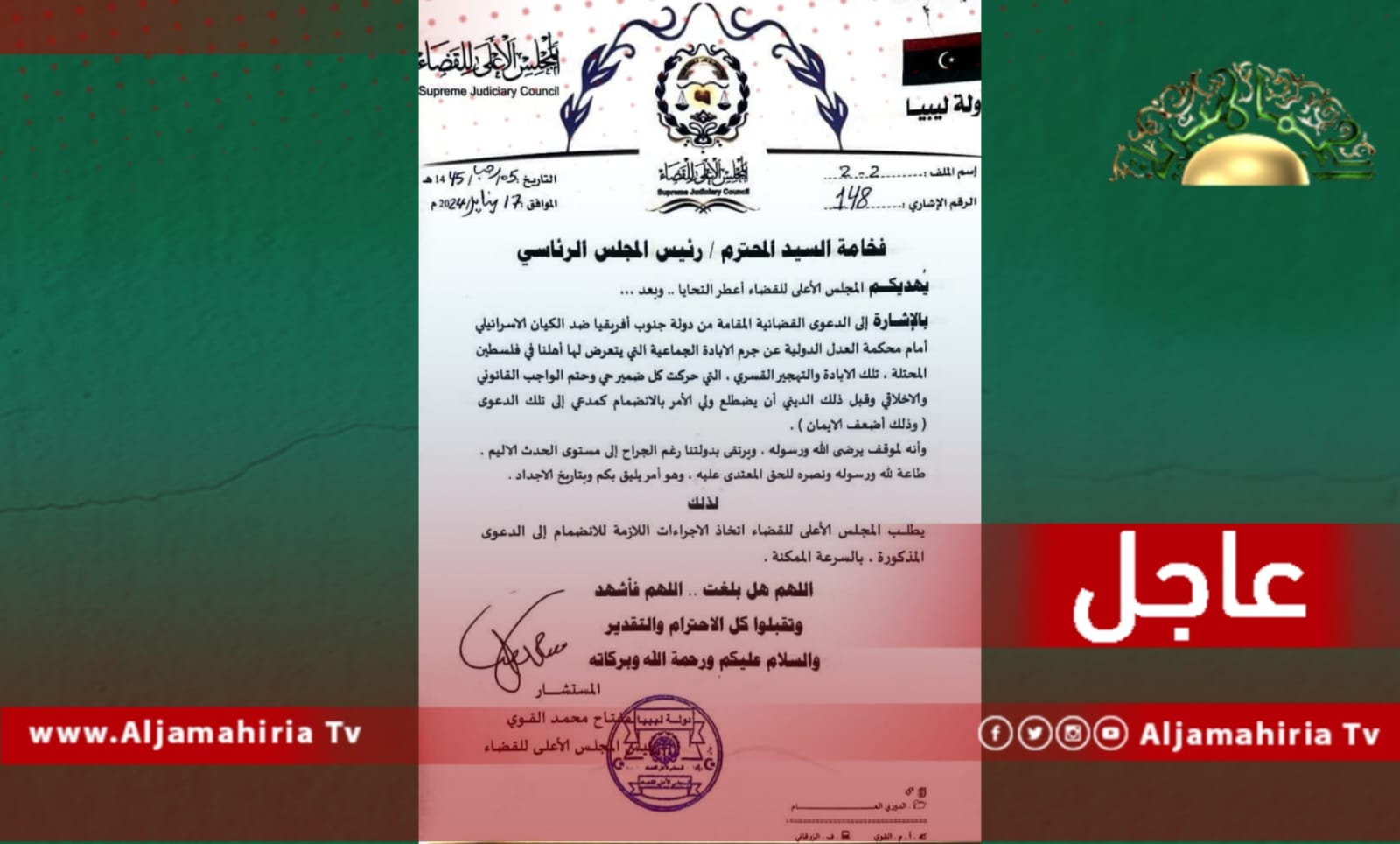 عاجل// رئيس المجلس الأعلى للقضاء يطالب رئيس المجلس الرئاسي بالانضمام إلى الدعوى القضائية المقامة من دولة جنوب إفريقيا ضد الكيان الإسرائيلي أمام محكمة العدل الدولية.