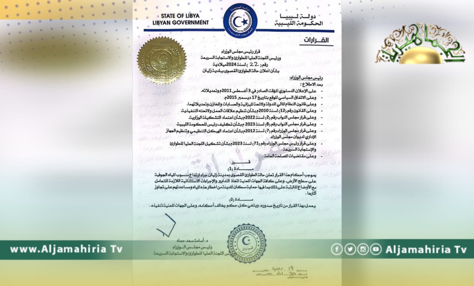 أعلنت الحكومة المكلفة من مجلس النواب، برئاسة اسامة حماد حالة الطوارئ القصوى في بلدية زليتن، واتخاذ تدابير فورية لحماية المواطنين من خطر الفيضانات الناتجة عن ارتفاع منسوب المياه الجوفية.