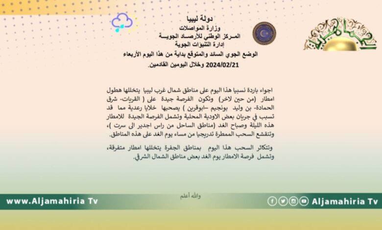 توقع مركز الأرصاد الجوية، وجود أجواء باردة نسبيا اليوم على مناطق شمال غرب ليبيا يتخللها هطول امطار، من حين لآخر، وتكون الفرصة جيدة على (القريات- شرق الحمادة- بن وليد بونجيم –أبوقرين) يصحبها خلايا رعدية، مما قد تسبب في جريان بعض الأودية المحلية.