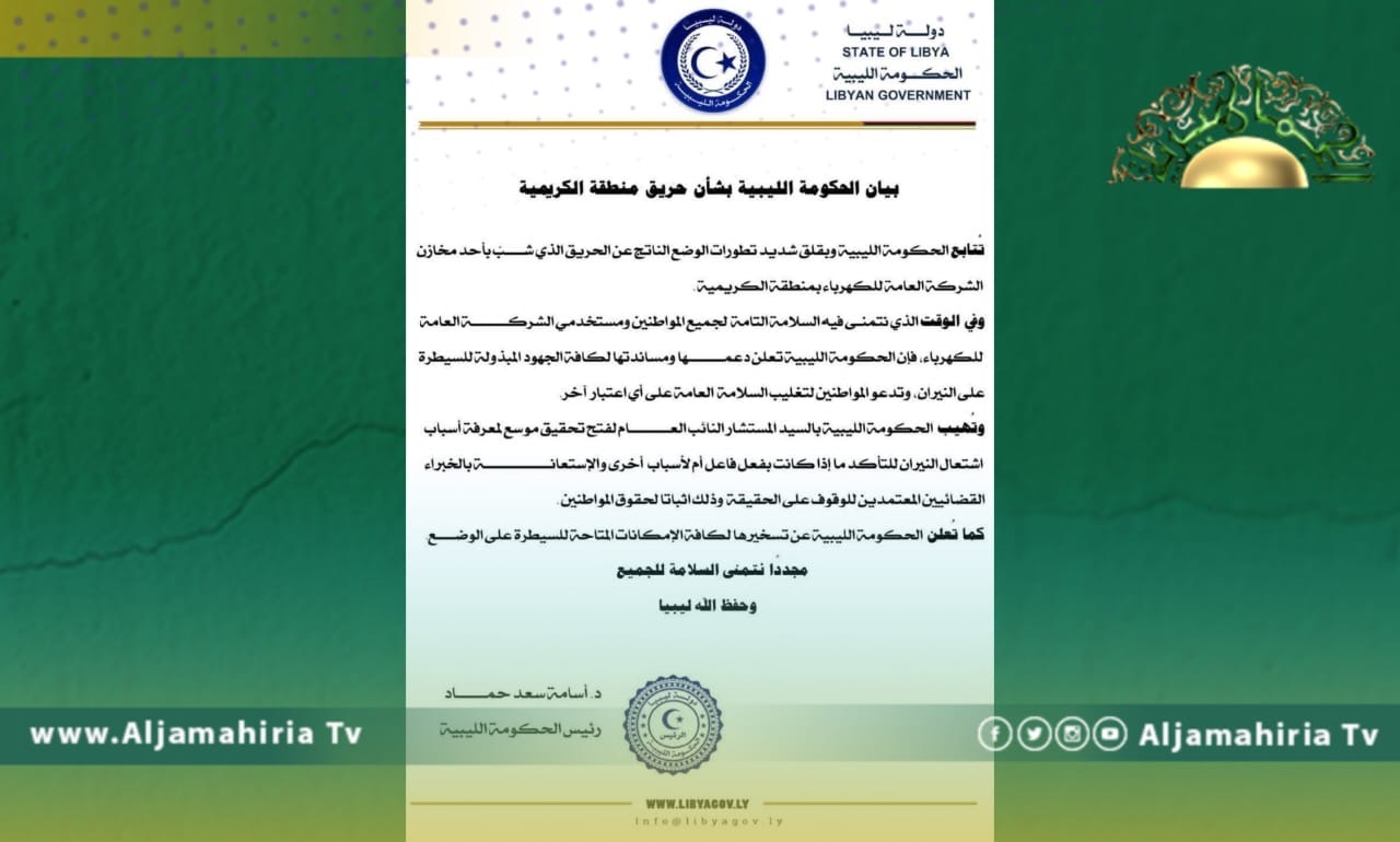 أعربت الحكومة المكلفة من مجلس النواب عن قلقها ازاء تطورات الوضع الناتج عن الحريق الذي شب بأحد مخازن الشركة العامة للكهرباء بمنطقة الكريمية.