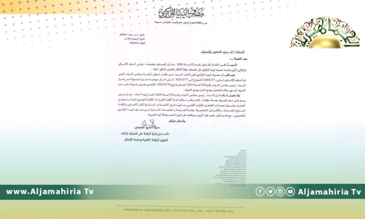 خاطب مصرف ليبيا المركزي، المصارف التجارية تنفيذ فرض ضريبة على سعر الصرف وتسهيل إجراءات التعامل بالنقد الأجنبي.