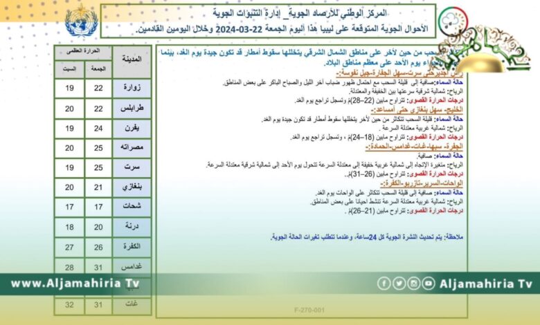 – حالة السماء: صافية إلى قليلة السحب مع احتمال ظهور ضباب آخر الليل وفي الصباح الباكر على بعض المناطق.