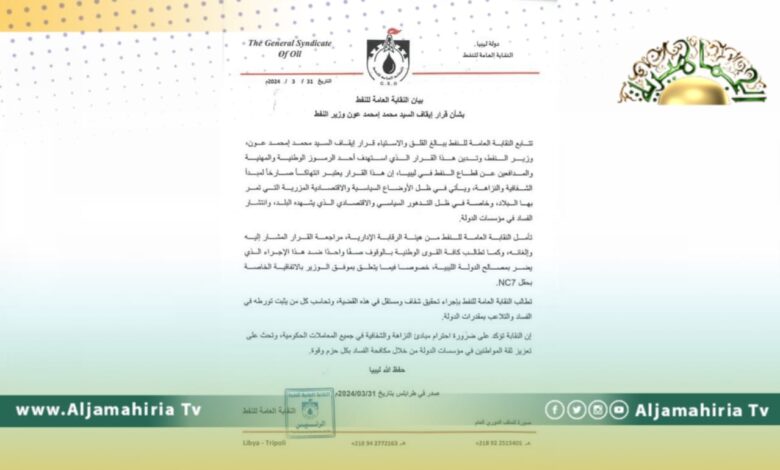 نقابة النفط: ايقاف عون انتهاك صارخ لمبدأ الشفافية والنزاهة في ظل الأوضاع المزرية بالبلاد