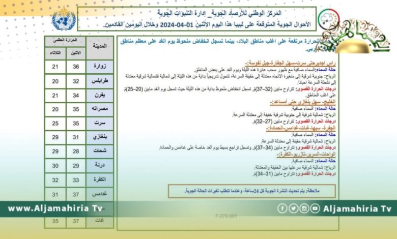 السماء صافية والرياح شمالية شرقية خفيفة إلى معتدلة السرعة ودرجات الحرارة القصوى تتراوح بين 34 و37 درجة مئوية وتسجل تراجعا بسيطا غدا خاصة على غدامس والحمادة.