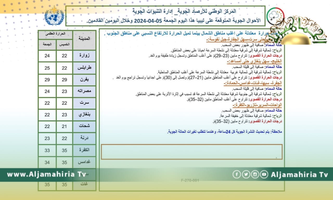 توقع المركز الوطني للأرصاد الجوية أن تكون درجات الحرارة معتدلة، اليوم الجمعة، على أغلب مناطق شمال ليبيا، بينما تميل الحرارة للارتفاع النسبي على مناطق الجنوب.