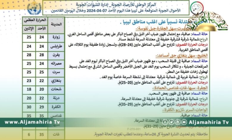 توقع المركز الوطني للأرصاد الجوية، اليوم الاحد أجواء معتدلة نسبياً على اغلب مناطق ليبيا.
