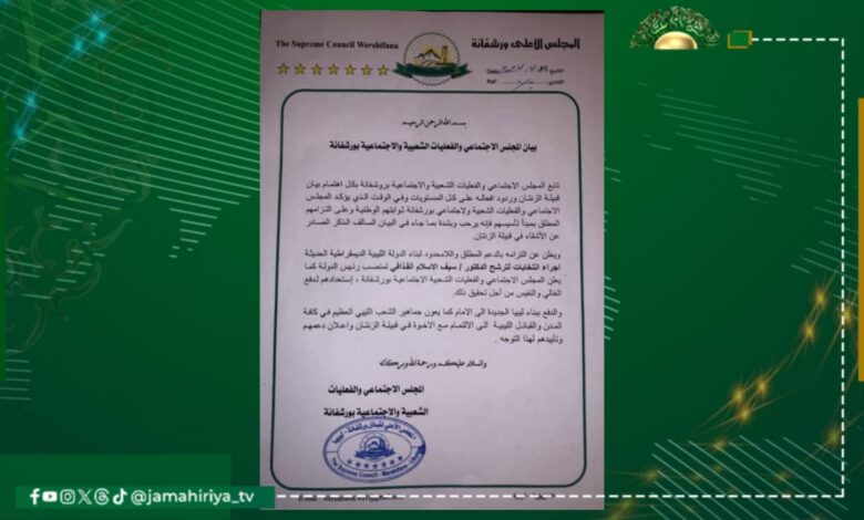 وأكد المجلس الاجتماعي والفعليات الشعبية والاجتماعية بورشفانة، إنه يتابع بكل اهتمام بيان قبيلة الزنتان وردود أفعاله على كل المستويات.