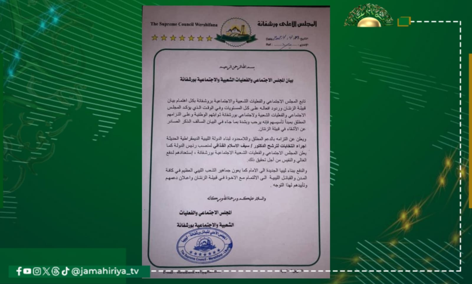 المجلس الاجتماعي ورشفانة يعلن ترحيبه ببيان قبيلة الزنتان المؤيد للمترشح الرئاسي سيف الإسلام القذافي