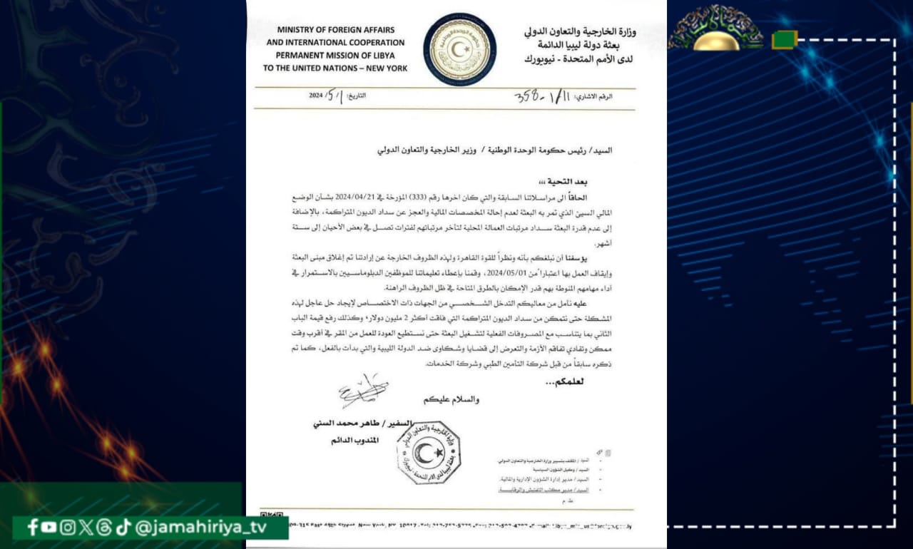 وشدد السني، إنه تم إغلاق مبنى البعثة وإيقاف العمل بها اعتباراً من 2024/05/01، مطالبا الدبيبة بأيجاد حل عاجل لهذه المشكلة حتى التمكن من سداد الديون المتراكمة التي فاقت أكثر 2 مليون دولار، وكذلك رفع قيمة الباب الثاني بما يتناسب مع المصروفات الفعلية لتشغيل البعثة.