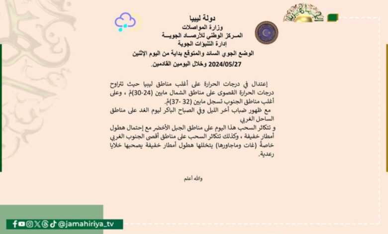توقع مركز الأرصاد الجوية، وجود إعتدال في درجات الحرارة على أغلب مناطق ليبيا حيث تتراوح درجات الحرارة القصوى على مناطق الشمال مابين (24-30)مْ ، وعلى أغلب مناطق الجنوب تسجل مابين (32 -37)مْ.