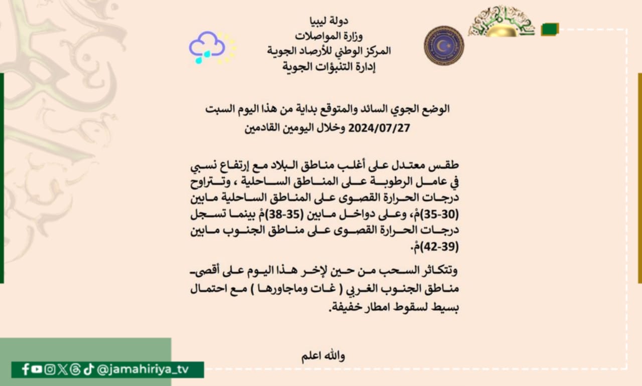 توقع مركز الأرصاد الجوية أن يسود طقس معتدل على أغلب مناطق البلاد مع إرتفاع نسبي في عامل الرطوبة على المناطق الساحلية.